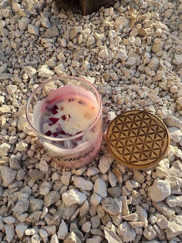 Notre bougie Amour a été créée avec du Quartz Rose, considérée comme la pierre du cœur par excellence.